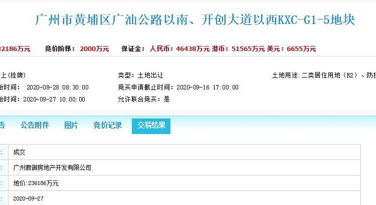 廣州君御(保利&翔龍)以236186萬元競得廣州市黃埔區廣汕公路以南、開創大道以西KXC-G1-5地塊,成交樓麵價15437元/㎡,實際樓麵價18447元/㎡。