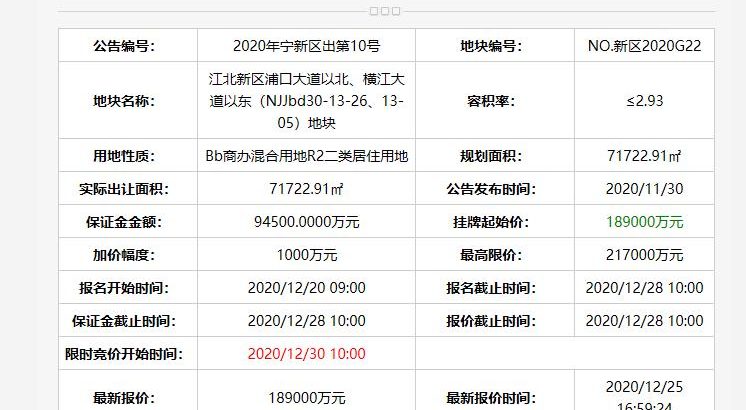 地塊編號NO.新區2020G22,地塊名稱為江北新區浦口大道以北、橫江大道以東地塊,出讓面積為7.17萬平,土地用途為商住用地,容積率2.94萬平,建築面積21.06萬平,起始價18.9億元。