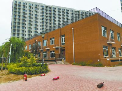 記者在小區西北角看到,這是一棟兩層樓的棕色建築,院門口擺放着幾個滅火器,以阻擋車輛進入。建築正門鎖着,側門用廢舊傢具擋着。透過玻璃窗,記者看到裏面堆放着大量雜物,看不出即將啟動的跡象。