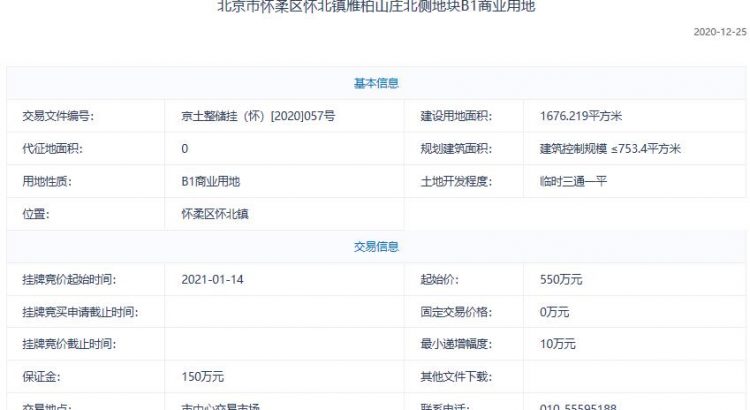 地塊編號京土整儲掛(懷)[2020]057號,地塊名稱為北京市懷柔區懷北鎮雁柏山莊北側地塊,建設用地面積為1676.219平方米,規劃建築面積≤753.4平方米,土地用途為B1商業用地,起始價550萬元。