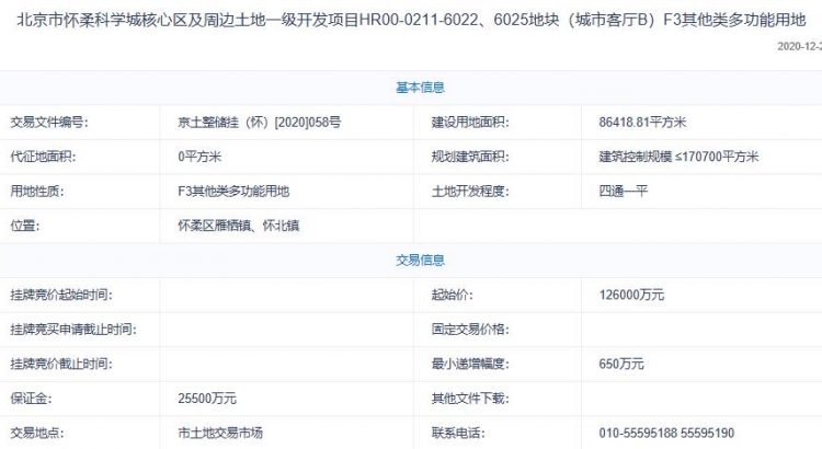 地塊編號京土整儲掛(懷)[2020]058號,地塊名稱為北京市懷柔科學城核心區及周邊土地一級開發項目HR00-0211-6022、6025地塊,建設用地面積8.64萬平,規劃建築面積≤170700平方米,土地用途為F3其他類多功能用地,地塊位於懷柔區雁棲鎮、懷北鎮,起始價12.6億元。