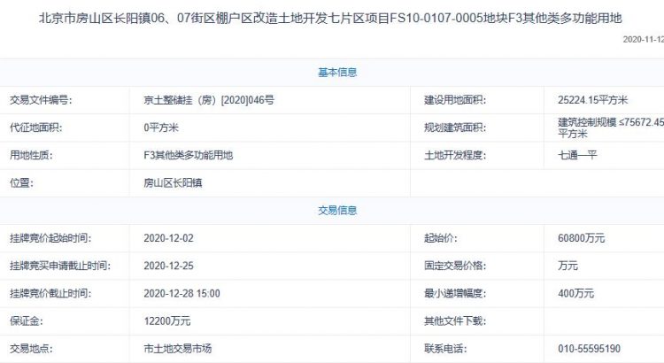 地塊編號京土整儲掛(房)[2020]046號,地塊名稱為北京市房山區長陽鎮06、07街區棚戶區改造土地開發七片區項目FS10-0107-0005地塊,建設用地面積2.52萬平,規劃建築面積≤75672.45平方米,土地用途為F3其他類多功能用地,起始價6.08億元。