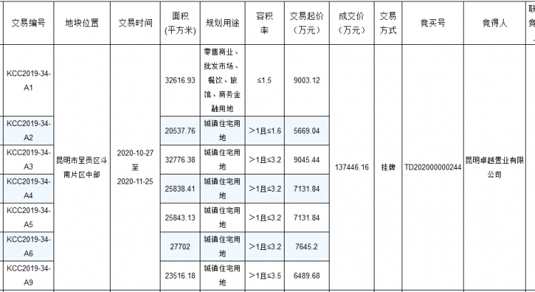 其中KCC2019-34-A1、A2、A3、A4、A5、A6、A9號地塊整體競買,統一開發建設,面積合計188830.79㎡(約283.25畝),交易起價52116.16萬元。