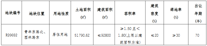 資料显示,該地塊編號為R20032,位於青年東路北、園林路東。出讓面積51790.62㎡,起始價118704.1萬元,建築密度≤20%,率≥30%,建築高度≤60米。