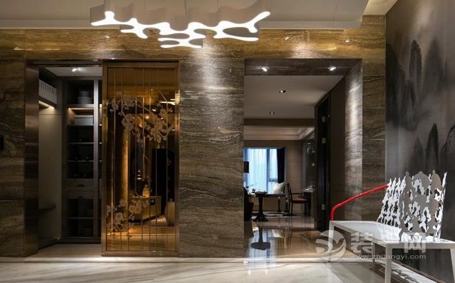 進門玄關處地面鋪着大理石,牆壁也用深色調的大理石做裝飾,懸挂着創意風的吊燈,擺放了鏤空創意造型的坐椅,打造出一個時尚感滿滿的玄關空間。