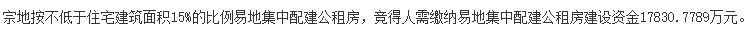 據土地出讓文件显示,宗地按不低於住宅建築面積15%的比例易地集中配建公租房,競得人需繳納易地集中配建公租房建設資金17830.7789萬元。