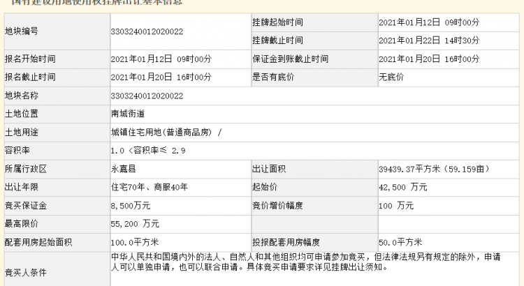 資料显示,該地塊編號為永資規告〔2020〕29號,位於南城街道,東側為規劃永興路,南側為規劃環城南路,西側為規劃下塘東路,北側為規劃西橋路。出讓面積39439.37㎡,起始價4.25億元,競買保證金8500萬元,建築密度≤30%,率≥30%,建築高度≤80米。