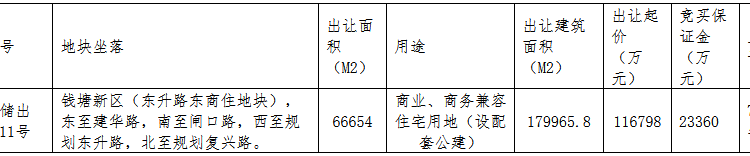 資料显示,該地塊編號為杭錢塘儲出[2020]11號,位於錢塘新區,東至建華路,南至閘口路,西至規劃東升路,北至規劃復興路。出讓面積66654㎡,起始價11.68億元,競買保證金2.34億元,上限價格為15.18億元。