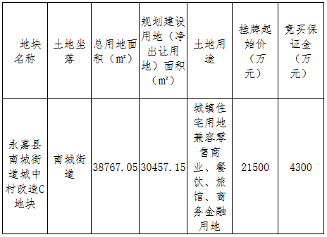 資料显示,該地塊編號為永資規告〔2020〕20號,位於永嘉縣南城街道,東側為規劃公園,南側為規劃下塘溪,西側為規劃永興路,北側為規劃河道。總用地面積38767.05㎡,規劃建設用地面積30457.15㎡,起始價2.15億元,競買保證金4300萬元。