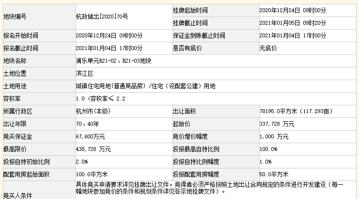 資料显示,該地塊編號為杭政儲出[2020]70號,位於濱江區,東至湯家河綠化,南至浦樂單元R22-04、R22-05、R22-06地塊,西至湯吳家巷,北至創智街。出讓面積78195㎡,起始價33.77億元,競買保證金6.76億元,上限價格為43.87億元。