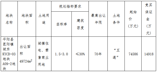 資料显示,該地塊編號為平資規告字[2020]48號,位於平陽縣昆陽鎮城東。出讓面積49724㎡,起始價7.46億元,競買保證金1.49億元,建築密度≤30%,率≥30%,建築高度:14米(4層及以上)-80米。