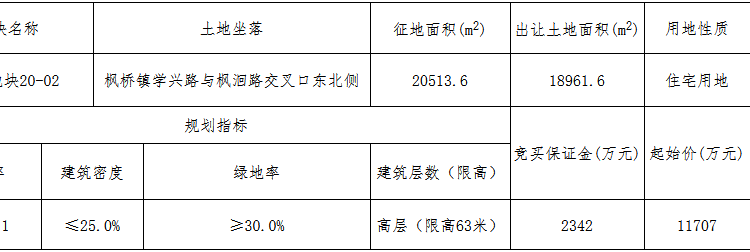 資料显示,該地塊編號為諸市自然告字[2020]47號,位於楓橋鎮學興路與楓洄路交叉口東北側。出讓面積18961.6㎡,起始價1.17億元,競買保證金2342萬元,建築密度≤25%,率≥30%,限高63米。