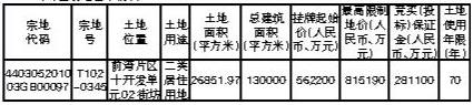 地塊編號T102-0345,地塊名稱前灣片區十開發單位02街坊,土地用途為居住用地,土地面積2.68萬平,總建面,建築容積率≤4.85,建築覆蓋率≤50%,建築高度或層數 ≤150米(且符合航空限高要求),總建築面積13萬平,起始價56.22億元。