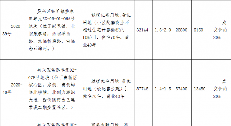 地塊編號2020-39號,地塊名稱吳興區織里鎮姚家田單元ZX-05-01-06A號地塊,出讓面積3.21萬平,土地用途為商住用地,容積率2,建築面積6.43萬平,起始價2.58億元。
