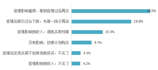 購房者如何看疫情後房價的走勢?調查显示,43.9%的受訪者認為房價會小幅下跌,27.6%的受訪者認為房價會保持穩定。對房價下跌的預期,可能來自於開發企業有儘快降價促銷迴流資金的需要。到去年年底,部分城市的新房庫存上升,面臨去化難的問題。以北京為例,截止目前,北京新房(普通住宅+自住型商品房+別墅)尚有9.6萬套待售房源,開發商降價促銷是大概率事件。購房者期待未來的降價空間,因此會進入觀望期。