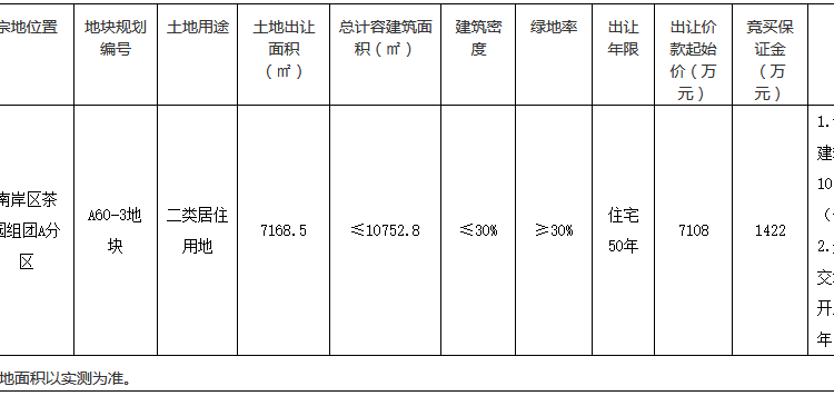 資料显示,該地塊序號為20129,位於南岸區茶園組團A分區。出讓面積7168.5㎡,起始價7108萬元,競買保證金1422萬元,建築密度≤30%,率≥30%。