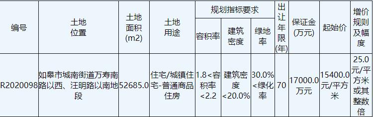 地塊編號R2020098,地塊位於南通如皋市,出讓面積5.26萬平,用途為住宅用地,容積率1.8-2.2,建築面積11.59萬平,出讓年限七十年,起始價8.11億元。