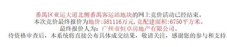 中國網地產訊 12月28日,廣州7宗地塊集中出讓,其中包括4宗涉宅用地,總起始價114.33億元。最終廣州市恆卓有限公司()以58.11億元競得番禺區亞運大道北側番禺客運站地塊,競配建面積6750平方米,溢價率45%。