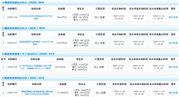 中國網地產訊 10月30日,廣州市集中掛牌4宗地塊,包括2宗商服用地、2宗住宅用地。分別位於白雲區、荔灣區、增城區、黃浦區,總起始價575498萬元。