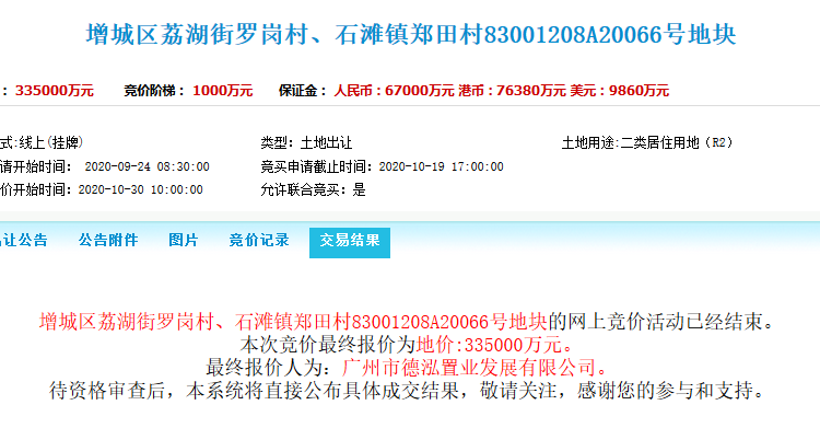 資料显示,該地塊編號為83001208A20066號,位於增城區荔湖街羅崗村、石灘鎮鄭田村。出讓面積124209.97㎡,起始價33.5億元,競買保證金6.7億元。