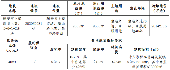 資料显示,該地塊編號為2020XG031號,位於瑞安市上望街道,隆山路以南、新橋路以西。出讓面積9655㎡,起始價20142.16萬元,競買保證金4029萬元,建築密度≤25%,其中住宅部分≤22%,率≥35%,建築高度≤54米。
