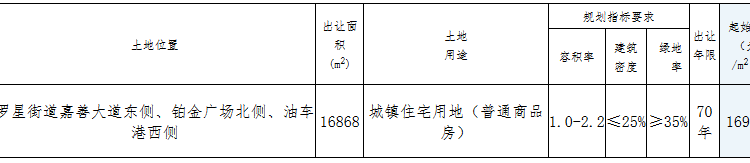 據土地出讓文件显示,本次網上交易採取“競價+競配建”的方式拍賣出讓。出讓起始價為50844萬元,最高限價為68544萬元,在最高限價內按照“價高者得”的原則確定競得入選人,初次報價不得低於起始價,報價以增價方式進行,增價幅度為100萬元或100萬元的整數倍,每次加價不得小於規定的增價幅度,本次出讓設有底價,競買人最後報價未達到底價時,拍賣出讓不成交;當有兩個或兩個以上競買人報價達到最高價時,轉入競報配建人才(公租)住房面積階段,人才(公租)住房起始面積為70平方米,最高投報面積為91420平方米,以競報配建人才(公租)住房面積最多者為競得入選人,初次投報面積不得低於起始面積,投報面積以增加面積方式進行,面積增幅為70平方米或70平方米的整數倍,每次增加面積不得小於規定的面積幅度,人才(公租)住房面積標準為40-70平方米,上下浮動5平方米;當有兩個或兩個以上競買人投報面積達到最高投報面積時,以首個競報最高投報面積的競買人確定為競得入選人。