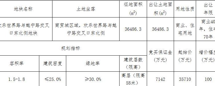 地塊編號諸市自然告字[2020]31號,地塊名稱歡樂世界路與越寧路交叉口東北側地塊,出讓面積3.64萬平,用途為商住用地,容積率1.8,建築面積6.56萬平,起始價3.57億元。