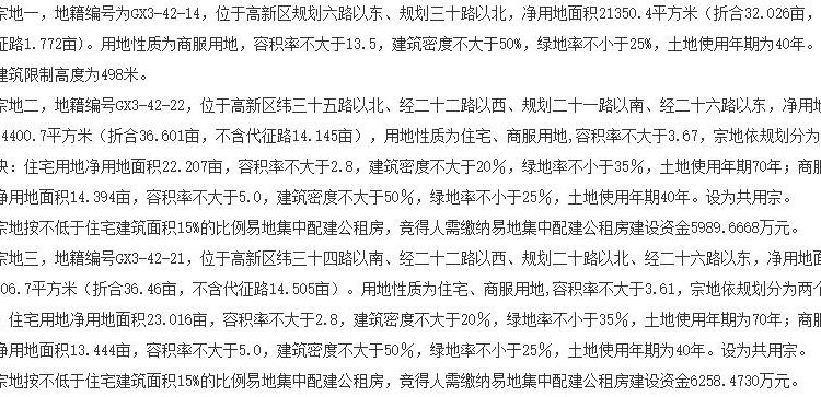 地塊編號GX3-42-22,位於高新區緯三十五路以北、經二十二路以西、規劃二十一路以南、經二十六路以東,凈用地面積24400.7平方米(摺合36.601畝,不含代征路14.145畝),用地性質為住宅、商服用地,容積率不大於3.67,宗地依規劃分為兩個地塊:住宅用地凈用地面積22.207畝,容積率不大於2.8,建築密度不大於20%,綠地率不小於35%,土地使用年期七十年;商服用地凈用地面積14.394畝,容積率不大於5.0,建築密度不大於50%,綠地率不小於25%,土地使用年期四十年。設為共用宗。