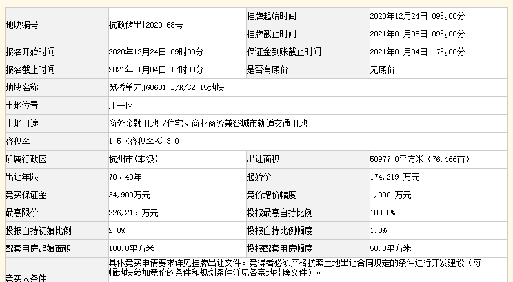 據土地出讓文件显示,該地塊掛牌出讓競買報價設置最高限價為247400萬元。當競買報價達到最高限價時,不再接受更高報價,按照優先原則,確定最先報出最高限價者為競得人。