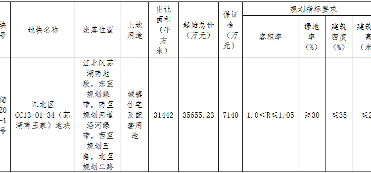 資料显示,該地塊編號為甬儲出2020-115號,位於江北區蓀湖南地段,東至規劃綠帶,南至規劃河道沿河綠帶,西至規劃五路,北至規劃二路。出讓面積31442㎡,起始價35655.23萬元,競買保證金7140萬元,建築密度≤35%,率≥30%,建築高度≤24米。