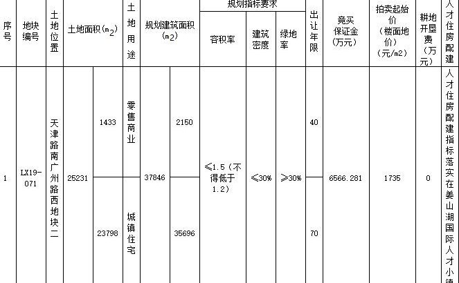 地塊編號淮自然(浦)掛2020第5號,地塊名稱為大同路南側地塊,出讓面積2.58萬平,用途為商住用地,容積率2.5,建築面積為6.46萬平,起始價3.3億元。