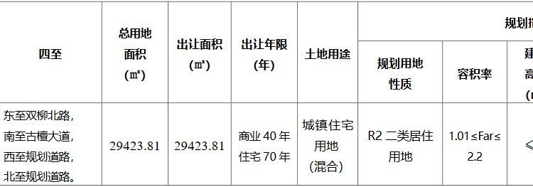 出讓文件显示,該地塊按“限房價、競地價”方式出讓,所建普通商品住宅(毛坯)銷售均價不得超過8755元/㎡(裝修價格另行核定),最高銷售單價不得超過售價均價的110%(裝修價格另行核定)。