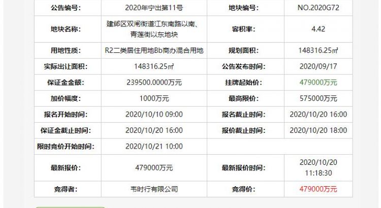 中國網地產訊10月21日,南京5宗地塊集中出讓,總起始價66.15億元。最終韋時行有限公司(香港嘉華)以47.9億元競得NO.2020G72號地塊,樓麵價7306.75元/平。