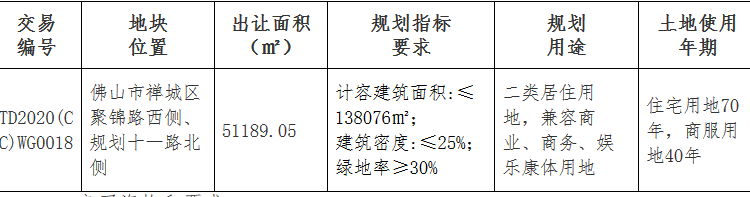 資料显示,該地塊位於禪城區聚錦路西側、規劃十一路北側。出讓面積51189.04㎡,起始價124269萬元,競買保證金24854萬元,建築密度≤25%,率≥30%。