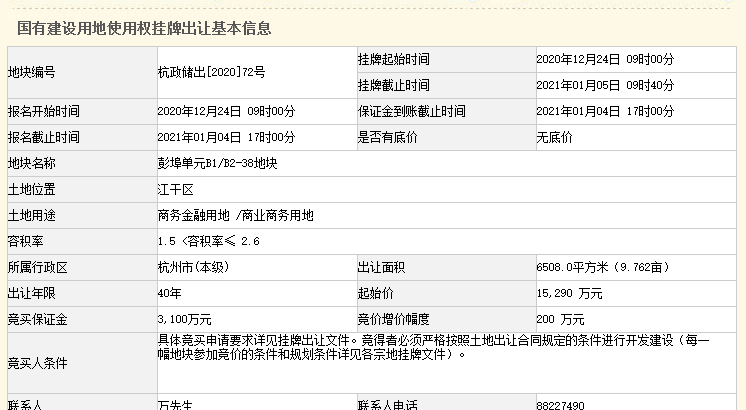 資料显示,該地塊編號為杭政儲出[2020]72號,位於江干區,東至環站東路,南至環站北路,西至規劃九號支路,北至規劃彭埠單元R22-23地塊。出讓面積6508㎡,起始價1.53億元,競買保證金3100萬元。