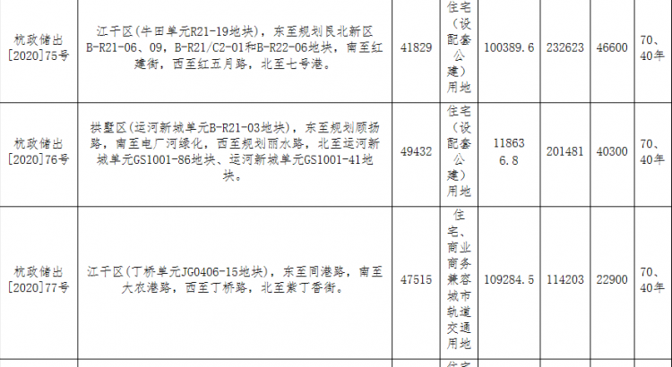 地塊編號杭政儲出[2020]76號,地塊名稱為運河新城單元B-R21-03地塊,出讓面積4.94萬平,土地用途為住宅用地,容積率2.4,建築面積11.86萬平,起始價20.15億元。