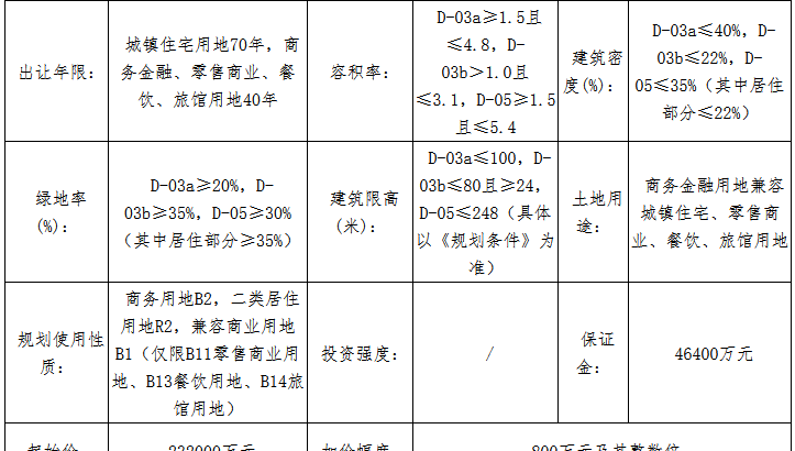 資料显示,該地塊編號為溫政務中心土告字〔2020〕124號,位於龍灣區蒲州街道江前村、上江村。出讓面積78697㎡,起始價23.2億元,上限價格為30.16億元,競買保證金4.64億元,建築密度:D-03a≤40%,D-03b≤22%,D-05≤35%(其中居住部分≤22%),率:D-03a≥20%,D-03b≥35%,D-05≥30%(其中居住部分≥35%),建築高度:D-03a≤100米,D-03b≤80米且≥24米,D-05≤248米。