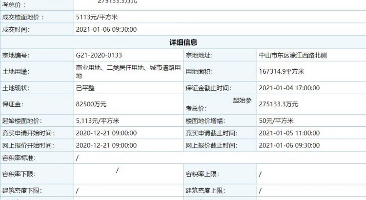 地塊編號G21-2020-0133,地塊位於中山市東區濠江西路北側,土地用途為商業用地、二類居住用地、城市道路用地,出讓面積167314.9平方米,起始價27.51億元。