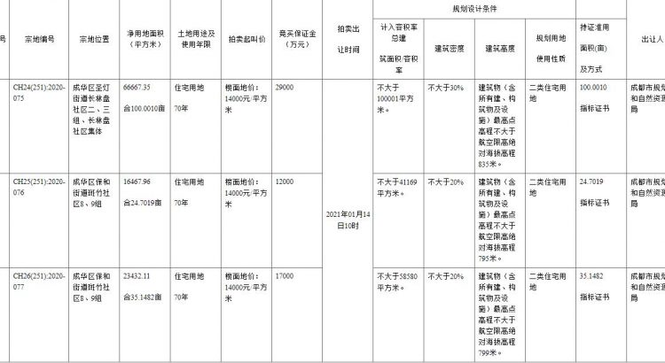 地塊編號CH25(251):2020-076號,地塊位於成華區保和街道,凈用地面積16467.96合24.7019畝,純住宅用地,計容面積不大於41169平方米,起始樓面地價14000元/㎡。