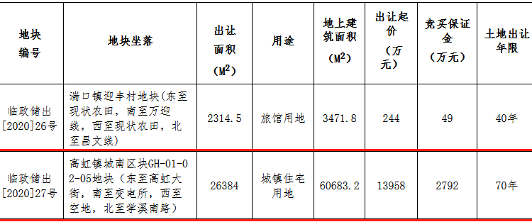 資料显示,該地塊編號為臨政儲出[2020]27號,位於臨安區,東至高虹大街,南至變電所,西至空地,北至學溪南路。出讓面積26384㎡,起始價13958萬元,競買保證金2792萬元,建築密度≤22%,率≥35%,建築高度≤54米。