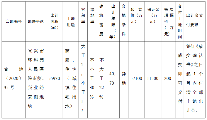 資料显示,該地塊編號為宜地(2020)35號,位於宜興市環科園人民醫院南側、興業路東側。出讓面積55930㎡,起始價5.71億元,競買保證金1.15億元,建築密度≤22%,率≥30%。