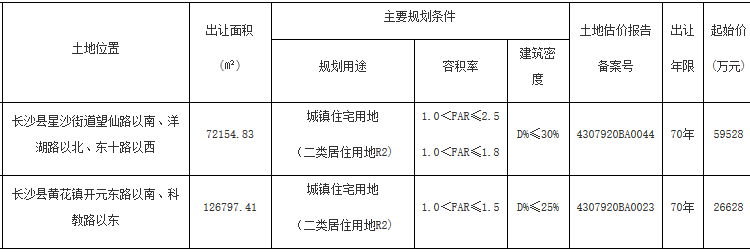 中國網地產訊  10月16日,湖南省市長沙縣以網上掛牌方式集中出讓2宗居住用地,總出讓面積198952.24㎡,總起始價86156萬元,總成交價99841萬元。