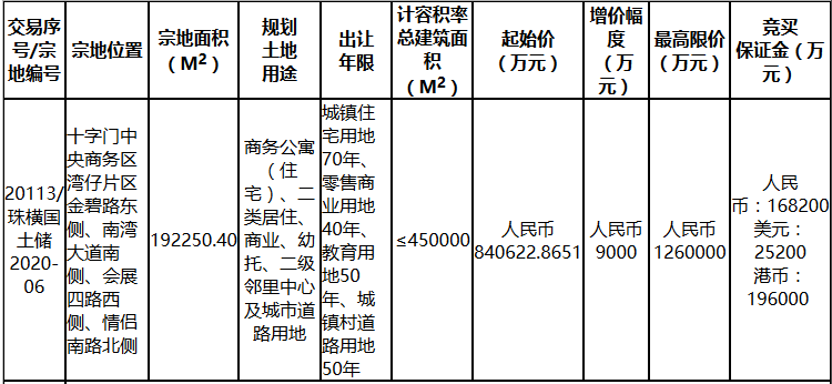資料显示,該地塊編號為珠橫國土儲2020-06,位於十字門中央商務區灣仔片區金碧路東側、南灣大道南側、會展四路西側、情侶南路北側。出讓面積192250.4㎡,起始價840622.8651萬元,起始樓麵價18681元/㎡,最高限價126億元,競買保證金16.82億元,增加幅度9000萬元。