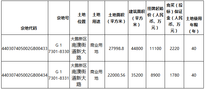 G17301-8330地塊代碼為440307405002GB00433,位於大鵬新區南澳街道新大路。出讓面積27998.8㎡,起始價1.11億元,競買保證金2220萬元。