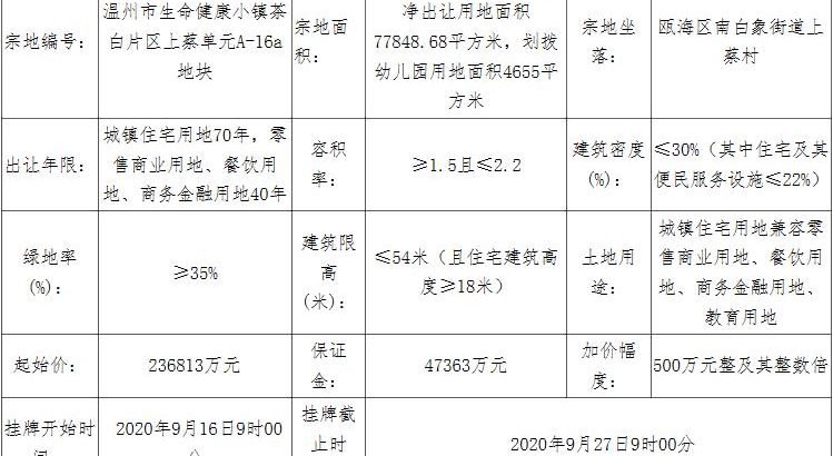 地塊編號溫政務中心土告字〔2020〕93號,地塊名稱溫州市生命健康小鎮茶白片區上蔡單元A-16a地塊,出讓面積7.78萬平,用途為商住用地,容積率為2.29,建築面積17.83萬平,起始價23.68億元。