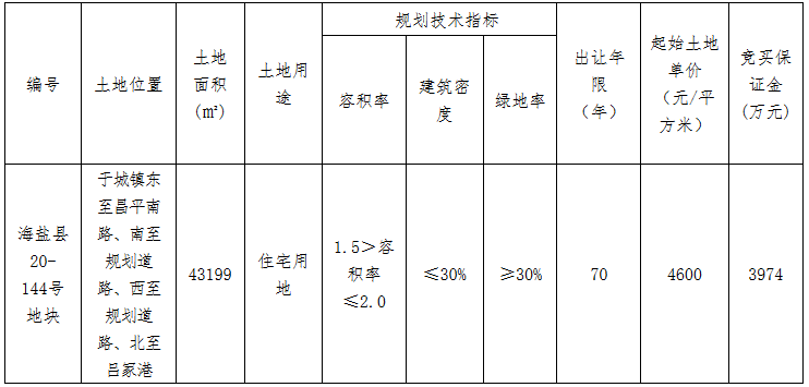 經過28輪競價,海寧鴻翔科大實業集團有限公司(鴻翔&科大)以21621.1萬元競得海鹽縣20-144號地塊,樓麵價2502元/㎡,溢價率8.8%。