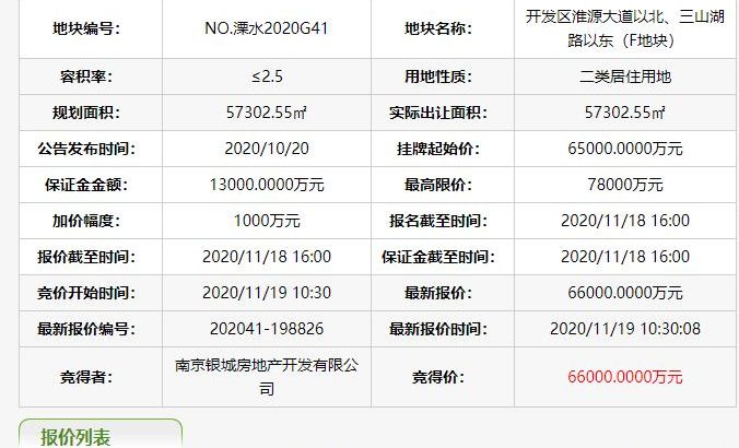 地塊編號NO. 溧水2020G41,地塊名稱開發區淮源大道以北、三山湖路以東 (F地塊),出讓面積5.73萬平,土地用途為住宅用地,容積率2.5,建築面積14.33萬平,起始價6.5億元。