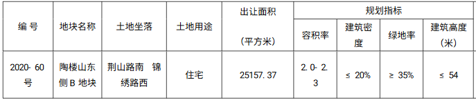 資料显示,該地塊編號為2020-60號,位於荊山路南、錦繡路西。出讓面積25157.37㎡,起始價2.265億元,建築密度≤20%,率≥35%,建築高度≤54米。