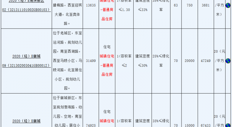 宿遷市裕羅新農村建設有限公司以底價4075.11萬元競得2020(經)E宿城13地塊,樓麵價750元/㎡。
